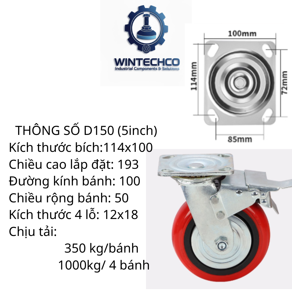 Bánh xe PU Hàn Quốc D150 (5 inch) xoay khóa